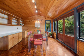 The dining room, with its parquet floors and generous proportions opens out to a patio where a grape-vine covered pergola creates a shady haven for summer relaxation and alfresco dining.