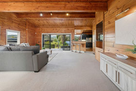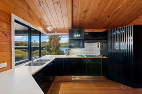 Clad in cedar weatherboard, schist and concrete block, the home nestles harmoniously into mature shrubbery, facing views of the lake, bush and farmland.